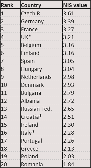 We see that this puts the Czech Republic at the top of the secularity league table, closely followed by Germany, France and the UK. The most religious countries are Romania, Poland and Greece.